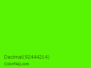 Decimal 92444214 Color is a normal green color and the nearest color is Bright Green #66ff00. Hex code #58f404 and RGB value is rgb(88,244,4). In RGB color space, this color is composed of 35% red, 96% green, 2% blue, In CMYK color space, this color is composed of 64% cyan, 0% magenta, 98% yellow , 4% black , In HSL color space, this color has a hue angle of 99° , 97% saturation and 49% lightness.