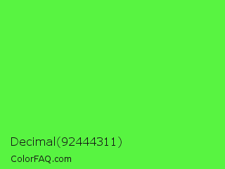 Decimal 92444311 Color is a light green color and the nearest color is Screamin Green #66ff66. Hex code #58f441 and RGB value is rgb(88,244,65). In RGB color space, this color is composed of 35% red, 96% green, 25% blue, In CMYK color space, this color is composed of 64% cyan, 0% magenta, 73% yellow , 4% black , In HSL color space, this color has a hue angle of 112° , 89% saturation and 61% lightness.