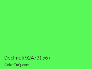 Decimal 92473156 Color is a light green color and the nearest color is Screamin Green #66ff66. Hex code #58f858 and RGB value is rgb(88,248,88). In RGB color space, this color is composed of 35% red, 97% green, 35% blue, In CMYK color space, this color is composed of 65% cyan, 0% magenta, 65% yellow , 3% black , In HSL color space, this color has a hue angle of 120° , 92% saturation and 66% lightness.
