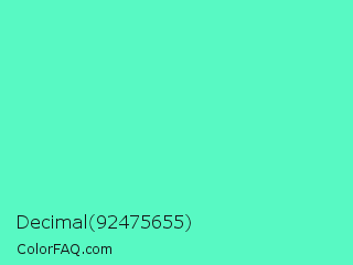 Decimal 92475655 Color is a light green color and the nearest color is Turquoise #40e0d0. Hex code #58f9c3 and RGB value is rgb(88,249,195). In RGB color space, this color is composed of 35% red, 98% green, 76% blue, In CMYK color space, this color is composed of 65% cyan, 0% magenta, 22% yellow , 2% black , In HSL color space, this color has a hue angle of 160° , 93% saturation and 66% lightness.