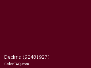 Decimal 92481927 Color is a very dark rose color and the nearest color is Dark Scarlet #560319. Hex code #59011b and RGB value is rgb(89,1,27). In RGB color space, this color is composed of 35% red, 0% green, 11% blue, In CMYK color space, this color is composed of 0% cyan, 99% magenta, 70% yellow , 65% black , In HSL color space, this color has a hue angle of 342° , 98% saturation and 18% lightness.