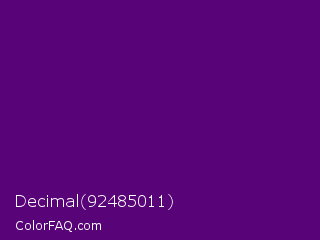 Decimal 92485011 Color is a dark purple color and the nearest color is Pigment Indigo #4b0082. Hex code #590379 and RGB value is rgb(89,3,121). In RGB color space, this color is composed of 35% red, 1% green, 47% blue, In CMYK color space, this color is composed of 26% cyan, 98% magenta, 0% yellow , 53% black , In HSL color space, this color has a hue angle of 284° , 95% saturation and 24% lightness.