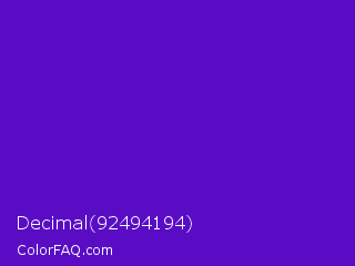 Decimal 92494194 Color is a normal violet color and the nearest color is Purple Heart Crayola #652dc1. Hex code #590cc4 and RGB value is rgb(89,12,196). In RGB color space, this color is composed of 35% red, 5% green, 77% blue, In CMYK color space, this color is composed of 55% cyan, 94% magenta, 0% yellow , 23% black , In HSL color space, this color has a hue angle of 265° , 88% saturation and 41% lightness.