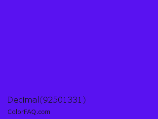 Decimal 92501331 Color is a normal indigo color and the nearest color is Han Purple #5218fa. Hex code #5912f1 and RGB value is rgb(89,18,241). In RGB color space, this color is composed of 35% red, 7% green, 95% blue, In CMYK color space, this color is composed of 63% cyan, 93% magenta, 0% yellow , 5% black , In HSL color space, this color has a hue angle of 259° , 89% saturation and 51% lightness.