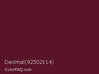 Decimal 92502114 Color is a very dark rose color and the nearest color is Wine Berry #591d35. Hex code #591426 and RGB value is rgb(89,20,38). In RGB color space, this color is composed of 35% red, 8% green, 15% blue, In CMYK color space, this color is composed of 0% cyan, 78% magenta, 57% yellow , 65% black , In HSL color space, this color has a hue angle of 344° , 63% saturation and 21% lightness.