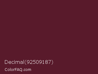 Decimal 92509187 Color is a dark rose color and the nearest color is Wine Berry #591d35. Hex code #591a2b and RGB value is rgb(89,26,43). In RGB color space, this color is composed of 35% red, 10% green, 17% blue, In CMYK color space, this color is composed of 0% cyan, 71% magenta, 52% yellow , 65% black , In HSL color space, this color has a hue angle of 344° , 55% saturation and 23% lightness.