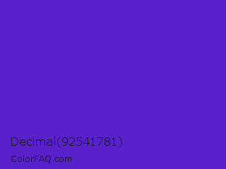 Decimal 92541781 Color is a normal indigo color and the nearest color is Purple Heart Crayola #652dc1. Hex code #5921cb and RGB value is rgb(89,33,203). In RGB color space, this color is composed of 35% red, 13% green, 80% blue, In CMYK color space, this color is composed of 56% cyan, 84% magenta, 0% yellow , 20% black , In HSL color space, this color has a hue angle of 260° , 72% saturation and 46% lightness.