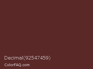 Decimal 92547459 Color is a dark red color and the nearest color is Caput Mortuum #592720. Hex code #592827 and RGB value is rgb(89,40,39). In RGB color space, this color is composed of 35% red, 16% green, 15% blue, In CMYK color space, this color is composed of 0% cyan, 55% magenta, 56% yellow , 65% black , In HSL color space, this color has a hue angle of 1° , 39% saturation and 25% lightness.