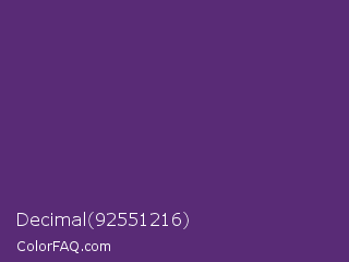 Decimal 92551216 Color is a normal purple color and the nearest color is Regalia #522d80. Hex code #592b76 and RGB value is rgb(89,43,118). In RGB color space, this color is composed of 35% red, 17% green, 46% blue, In CMYK color space, this color is composed of 25% cyan, 64% magenta, 0% yellow , 54% black , In HSL color space, this color has a hue angle of 277° , 47% saturation and 32% lightness.