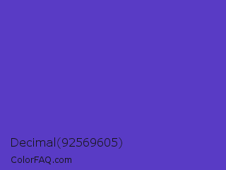 Decimal 92569605 Color is a normal indigo color and the nearest color is Purple Heart Crayola #652dc1. Hex code #593bc5 and RGB value is rgb(89,59,197). In RGB color space, this color is composed of 35% red, 23% green, 77% blue, In CMYK color space, this color is composed of 55% cyan, 70% magenta, 0% yellow , 23% black , In HSL color space, this color has a hue angle of 253° , 54% saturation and 50% lightness.