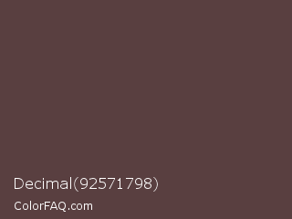 Decimal 92571798 Color is a dark red color and the nearest color is Kabul #5e483e. Hex code #593f40 and RGB value is rgb(89,63,64). In RGB color space, this color is composed of 35% red, 25% green, 25% blue, In CMYK color space, this color is composed of 0% cyan, 29% magenta, 28% yellow , 65% black , In HSL color space, this color has a hue angle of 358° , 17% saturation and 30% lightness.