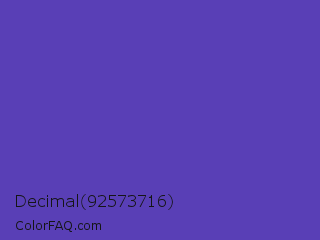 Decimal 92573716 Color is a normal indigo color and the nearest color is Plump Purple #5946b2. Hex code #593fb6 and RGB value is rgb(89,63,182). In RGB color space, this color is composed of 35% red, 25% green, 71% blue, In CMYK color space, this color is composed of 51% cyan, 65% magenta, 0% yellow , 29% black , In HSL color space, this color has a hue angle of 253° , 49% saturation and 48% lightness.
