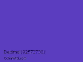 Decimal 92573730 Color is a normal indigo color and the nearest color is Ocean Blue #4f42b5. Hex code #593fbe and RGB value is rgb(89,63,190). In RGB color space, this color is composed of 35% red, 25% green, 75% blue, In CMYK color space, this color is composed of 53% cyan, 67% magenta, 0% yellow , 25% black , In HSL color space, this color has a hue angle of 252° , 50% saturation and 50% lightness.