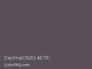 Decimal 92614679 Color is a normal magenta color and the nearest color is Davys Grey #555555. Hex code #594f59 and RGB value is rgb(89,79,89). In RGB color space, this color is composed of 35% red, 31% green, 35% blue, In CMYK color space, this color is composed of 0% cyan, 11% magenta, 0% yellow , 65% black , In HSL color space, this color has a hue angle of 300° , 6% saturation and 33% lightness.
