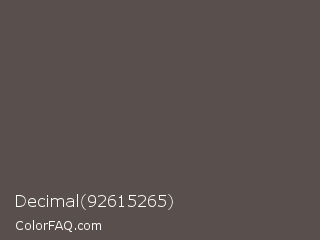 Decimal 92615265 Color is a normal color and the nearest color is Fuscous Gray #54534d. Hex code #59504d and RGB value is rgb(89,80,77). In RGB color space, this color is composed of 35% red, 31% green, 30% blue, In CMYK color space, this color is composed of 0% cyan, 10% magenta, 13% yellow , 65% black , In HSL color space, this color has a hue angle of 15° , 7% saturation and 33% lightness.