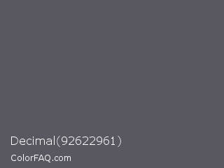 Decimal 92622961 Color is a normal indigo color and the nearest color is Scarpa Flow #585562. Hex code #59575f and RGB value is rgb(89,87,95). In RGB color space, this color is composed of 35% red, 34% green, 37% blue, In CMYK color space, this color is composed of 6% cyan, 8% magenta, 0% yellow , 63% black , In HSL color space, this color has a hue angle of 255° , 4% saturation and 36% lightness.