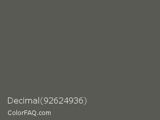 Decimal 92624936 Color is a normal yellow color and the nearest color is Chicago #5d5c58. Hex code #595a54 and RGB value is rgb(89,90,84). In RGB color space, this color is composed of 35% red, 35% green, 33% blue, In CMYK color space, this color is composed of 1% cyan, 0% magenta, 7% yellow , 65% black , In HSL color space, this color has a hue angle of 70° , 3% saturation and 34% lightness.