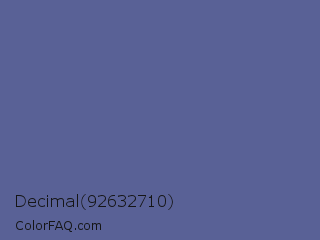 Decimal 92632710 Color is a normal blue color and the nearest color is UCLA Blue #536895. Hex code #596196 and RGB value is rgb(89,97,150). In RGB color space, this color is composed of 35% red, 38% green, 59% blue, In CMYK color space, this color is composed of 41% cyan, 35% magenta, 0% yellow , 41% black , In HSL color space, this color has a hue angle of 232° , 26% saturation and 47% lightness.
