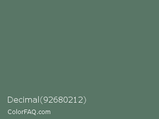 Decimal 92680212 Color is a normal green color and the nearest color is Como #517c66. Hex code #597666 and RGB value is rgb(89,118,102). In RGB color space, this color is composed of 35% red, 46% green, 40% blue, In CMYK color space, this color is composed of 25% cyan, 0% magenta, 14% yellow , 54% black , In HSL color space, this color has a hue angle of 147° , 14% saturation and 41% lightness.