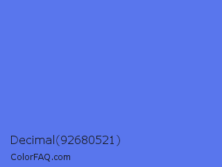 Decimal 92680521 Color is a light blue color and the nearest color is Blueberry #4f86f7. Hex code #5976ed and RGB value is rgb(89,118,237). In RGB color space, this color is composed of 35% red, 46% green, 93% blue, In CMYK color space, this color is composed of 62% cyan, 50% magenta, 0% yellow , 7% black , In HSL color space, this color has a hue angle of 228° , 80% saturation and 64% lightness.