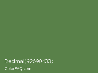 Decimal 92690433 Color is a normal green color and the nearest color is Hippie Green #53824b. Hex code #598149 and RGB value is rgb(89,129,73). In RGB color space, this color is composed of 35% red, 51% green, 29% blue, In CMYK color space, this color is composed of 31% cyan, 0% magenta, 43% yellow , 49% black , In HSL color space, this color has a hue angle of 103° , 28% saturation and 40% lightness.