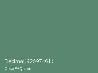 Decimal 92697461 Color is a normal green color and the nearest color is Spring Leaves #578363. Hex code #59876f and RGB value is rgb(89,135,111). In RGB color space, this color is composed of 35% red, 53% green, 44% blue, In CMYK color space, this color is composed of 34% cyan, 0% magenta, 18% yellow , 47% black , In HSL color space, this color has a hue angle of 149° , 21% saturation and 44% lightness.