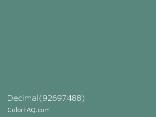 Decimal 92697488 Color is a normal cyan color and the nearest color is Wintergreen Dream #56887d. Hex code #59877e and RGB value is rgb(89,135,126). In RGB color space, this color is composed of 35% red, 53% green, 49% blue, In CMYK color space, this color is composed of 34% cyan, 0% magenta, 7% yellow , 47% black , In HSL color space, this color has a hue angle of 168° , 21% saturation and 44% lightness.