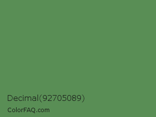 Decimal 92705089 Color is a normal green color and the nearest color is Middle Green #4d8c57. Hex code #598e55 and RGB value is rgb(89,142,85). In RGB color space, this color is composed of 35% red, 56% green, 33% blue, In CMYK color space, this color is composed of 37% cyan, 0% magenta, 40% yellow , 44% black , In HSL color space, this color has a hue angle of 116° , 25% saturation and 45% lightness.