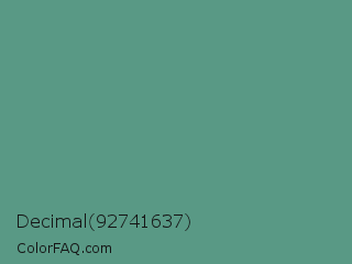 Decimal 92741637 Color is a normal green color and the nearest color is Patina #639a8f. Hex code #599985 and RGB value is rgb(89,153,133). In RGB color space, this color is composed of 35% red, 60% green, 52% blue, In CMYK color space, this color is composed of 42% cyan, 0% magenta, 13% yellow , 40% black , In HSL color space, this color has a hue angle of 161° , 26% saturation and 47% lightness.