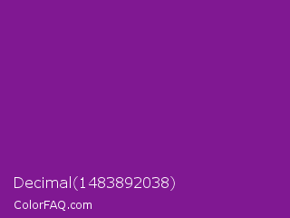 Decimal 1483892038 Color is a normal purple color and the nearest color is Seance #731e8f. Hex code #801892 and RGB value is rgb(128,24,146). In RGB color space, this color is composed of 50% red, 9% green, 57% blue, In CMYK color space, this color is composed of 12% cyan, 84% magenta, 0% yellow , 43% black , In HSL color space, this color has a hue angle of 291° , 72% saturation and 33% lightness.