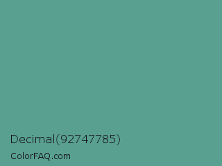Decimal 92747785 Color is a normal cyan color and the nearest color is Polished Pine #5da493. Hex code #59a091 and RGB value is rgb(89,160,145). In RGB color space, this color is composed of 35% red, 63% green, 57% blue, In CMYK color space, this color is composed of 44% cyan, 0% magenta, 9% yellow , 37% black , In HSL color space, this color has a hue angle of 167° , 29% saturation and 49% lightness.