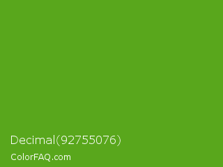 Decimal 92755076 Color is a normal green color and the nearest color is Christi #67a712. Hex code #59a71c and RGB value is rgb(89,167,28). In RGB color space, this color is composed of 35% red, 65% green, 11% blue, In CMYK color space, this color is composed of 47% cyan, 0% magenta, 83% yellow , 35% black , In HSL color space, this color has a hue angle of 94° , 71% saturation and 38% lightness.