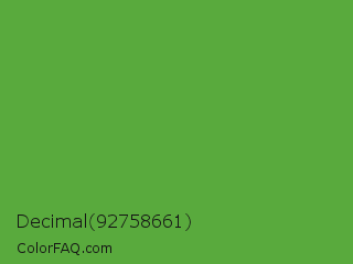 Decimal 92758661 Color is a normal green color and the nearest color is Apple #4fa83d. Hex code #59aa3d and RGB value is rgb(89,170,61). In RGB color space, this color is composed of 35% red, 67% green, 24% blue, In CMYK color space, this color is composed of 48% cyan, 0% magenta, 64% yellow , 33% black , In HSL color space, this color has a hue angle of 105° , 47% saturation and 45% lightness.