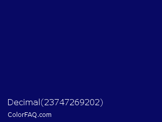 Decimal 23747269202 Color is a very dark blue color and the nearest color is Arapawa #110c6c. Hex code #080964 and RGB value is rgb(8,9,100). In RGB color space, this color is composed of 3% red, 4% green, 39% blue, In CMYK color space, this color is composed of 92% cyan, 91% magenta, 0% yellow , 61% black , In HSL color space, this color has a hue angle of 239° , 85% saturation and 21% lightness.