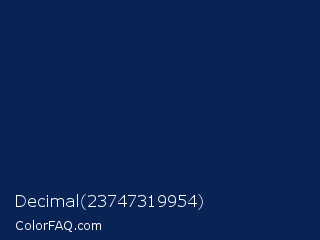 Decimal 23747319954 Color is a very dark blue color and the nearest color is Downriver #092256. Hex code #082354 and RGB value is rgb(8,35,84). In RGB color space, this color is composed of 3% red, 14% green, 33% blue, In CMYK color space, this color is composed of 90% cyan, 58% magenta, 0% yellow , 67% black , In HSL color space, this color has a hue angle of 219° , 83% saturation and 18% lightness.