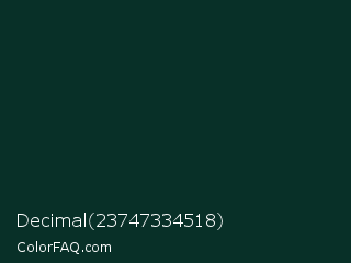 Decimal 23747334518 Color is a very dark cyan color and the nearest color is Bottle Green #093624. Hex code #083028 and RGB value is rgb(8,48,40). In RGB color space, this color is composed of 3% red, 19% green, 16% blue, In CMYK color space, this color is composed of 83% cyan, 0% magenta, 17% yellow , 81% black , In HSL color space, this color has a hue angle of 168° , 71% saturation and 11% lightness.