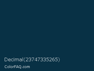 Decimal 23747335265 Color is a very dark blue color and the nearest color is Blue Whale #042e4c. Hex code #083145 and RGB value is rgb(8,49,69). In RGB color space, this color is composed of 3% red, 19% green, 27% blue, In CMYK color space, this color is composed of 88% cyan, 29% magenta, 0% yellow , 73% black , In HSL color space, this color has a hue angle of 200° , 79% saturation and 15% lightness.