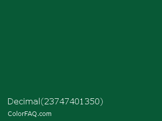 Decimal 23747401350 Color is a very dark green color and the nearest color is Sacramento State Green #00563f. Hex code #085936 and RGB value is rgb(8,89,54). In RGB color space, this color is composed of 3% red, 35% green, 21% blue, In CMYK color space, this color is composed of 91% cyan, 0% magenta, 39% yellow , 65% black , In HSL color space, this color has a hue angle of 154° , 84% saturation and 19% lightness.