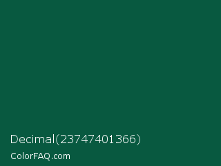 Decimal 23747401366 Color is a very dark green color and the nearest color is Sacramento State Green #00563f. Hex code #085940 and RGB value is rgb(8,89,64). In RGB color space, this color is composed of 3% red, 35% green, 25% blue, In CMYK color space, this color is composed of 91% cyan, 0% magenta, 28% yellow , 65% black , In HSL color space, this color has a hue angle of 161° , 84% saturation and 19% lightness.