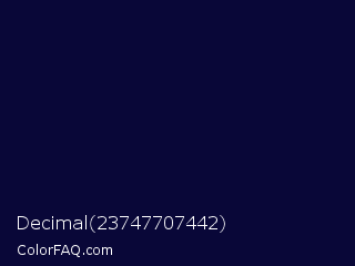 Decimal 23747707442 Color is a very dark indigo color and the nearest color is Black Rock #0d0332. Hex code #090738 and RGB value is rgb(9,7,56). In RGB color space, this color is composed of 4% red, 3% green, 22% blue, In CMYK color space, this color is composed of 84% cyan, 88% magenta, 0% yellow , 78% black , In HSL color space, this color has a hue angle of 242° , 78% saturation and 12% lightness.