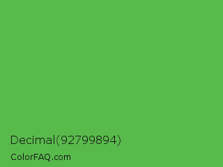 Decimal 92799894 Color is a normal green color and the nearest color is Apple #4fa83d. Hex code #59ba4c and RGB value is rgb(89,186,76). In RGB color space, this color is composed of 35% red, 73% green, 30% blue, In CMYK color space, this color is composed of 52% cyan, 0% magenta, 59% yellow , 27% black , In HSL color space, this color has a hue angle of 113° , 44% saturation and 51% lightness.