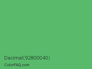 Decimal 92800040 Color is a normal green color and the nearest color is Fern #63b76c. Hex code #59ba6c and RGB value is rgb(89,186,108). In RGB color space, this color is composed of 35% red, 73% green, 42% blue, In CMYK color space, this color is composed of 52% cyan, 0% magenta, 42% yellow , 27% black , In HSL color space, this color has a hue angle of 132° , 41% saturation and 54% lightness.
