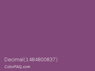 Decimal 1484800837 Color is a normal magenta color and the nearest color is Twilight Lavender #8a496b. Hex code #814879 and RGB value is rgb(129,72,121). In RGB color space, this color is composed of 51% red, 28% green, 47% blue, In CMYK color space, this color is composed of 0% cyan, 44% magenta, 6% yellow , 49% black , In HSL color space, this color has a hue angle of 308° , 28% saturation and 39% lightness.