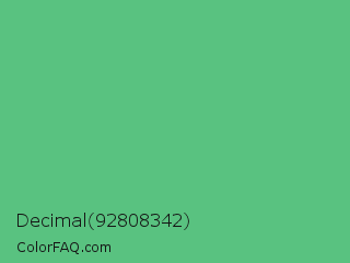 Decimal 92808342 Color is a normal green color and the nearest color is Emerald #50c878. Hex code #59c280 and RGB value is rgb(89,194,128). In RGB color space, this color is composed of 35% red, 76% green, 50% blue, In CMYK color space, this color is composed of 54% cyan, 0% magenta, 34% yellow , 24% black , In HSL color space, this color has a hue angle of 142° , 46% saturation and 55% lightness.