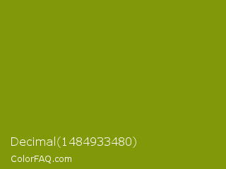 Decimal 1484933480 Color is a normal yellow color and the nearest color is Limeade #6f9d02. Hex code #819908 and RGB value is rgb(129,153,8). In RGB color space, this color is composed of 51% red, 60% green, 3% blue, In CMYK color space, this color is composed of 16% cyan, 0% magenta, 95% yellow , 40% black , In HSL color space, this color has a hue angle of 70° , 90% saturation and 32% lightness.