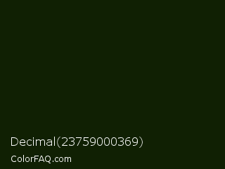 Decimal 23759000369 Color is a almost black green color and the nearest color is Pine Tree #171f04. Hex code #102003 and RGB value is rgb(16,32,3). In RGB color space, this color is composed of 6% red, 13% green, 1% blue, In CMYK color space, this color is composed of 50% cyan, 0% magenta, 91% yellow , 87% black , In HSL color space, this color has a hue angle of 93° , 83% saturation and 7% lightness.
