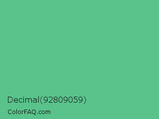 Decimal 92809059 Color is a normal green color and the nearest color is Ocean Green #48bf91. Hex code #59c38b and RGB value is rgb(89,195,139). In RGB color space, this color is composed of 35% red, 76% green, 55% blue, In CMYK color space, this color is composed of 54% cyan, 0% magenta, 29% yellow , 24% black , In HSL color space, this color has a hue angle of 148° , 47% saturation and 56% lightness.