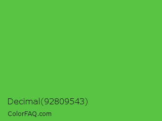 Decimal 92809543 Color is a normal green color and the nearest color is Green RYB #66b032. Hex code #59c443 and RGB value is rgb(89,196,67). In RGB color space, this color is composed of 35% red, 77% green, 26% blue, In CMYK color space, this color is composed of 55% cyan, 0% magenta, 66% yellow , 23% black , In HSL color space, this color has a hue angle of 110° , 52% saturation and 52% lightness.