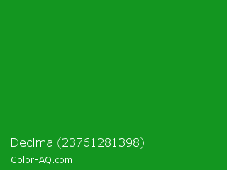 Decimal 23761281398 Color is a normal green color and the nearest color is Forest Green #228b22. Hex code #139620 and RGB value is rgb(19,150,32). In RGB color space, this color is composed of 7% red, 59% green, 13% blue, In CMYK color space, this color is composed of 87% cyan, 0% magenta, 79% yellow , 41% black , In HSL color space, this color has a hue angle of 126° , 78% saturation and 33% lightness.
