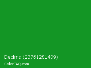 Decimal 23761281409 Color is a normal green color and the nearest color is Forest Green #228b22. Hex code #139625 and RGB value is rgb(19,150,37). In RGB color space, this color is composed of 7% red, 59% green, 15% blue, In CMYK color space, this color is composed of 87% cyan, 0% magenta, 75% yellow , 41% black , In HSL color space, this color has a hue angle of 128° , 78% saturation and 33% lightness.